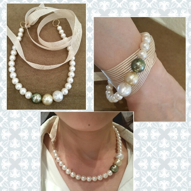 お客様の持っておられたパールネックレスにバロック南洋真珠を入れてリフォームしました。ブレスレットにもネックレスにも・・・お好きなリボン等を付けて楽しんで頂けます。