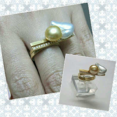 店頭にあったバロックパールのルースより、オーダーしました。一本はダイヤだけのリングで、もう一本にパールを2個付けました。一本ずつでも使えます。