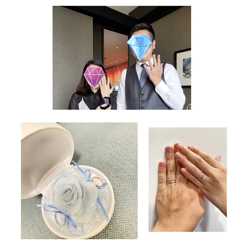 彼はしっかりと重量感のあるつや消しリングで、彼女はダイヤを入れたシンブルなリングで、お互いの好みを取り入れての素敵なペアリングが出来ました。